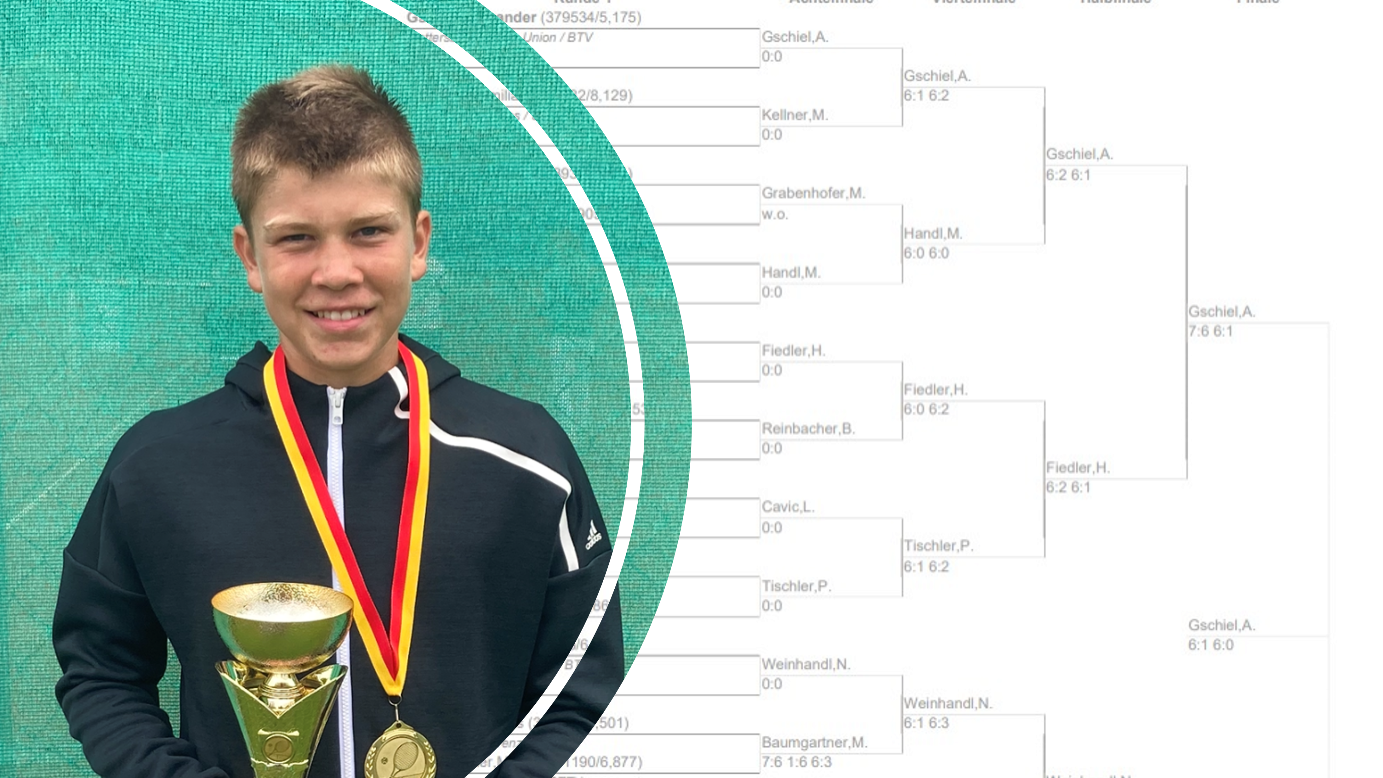 In Neudörfl gelang dem Mattersburger sogar ein „Doppelpack“. Denn auch der Doppelbewerb wurde mit Partner dem Janosch Mendl (STTV) zu Gschiels Beute. Im Endspiel setzte sich die als Nummer zwei eingestufte Paarung gegen die topgesetzten Rafael Ficjan (STTV)/Paul Schmid (WTV) klar mit 6:2, 6:2 durch. Noch klarere Ergebnisse sollte Alex im Einzelbewerb einfahren bei seinem fünf Siegen auf dem Weg zum Titel gab der Burgenländer lediglich zehn Games ab. Vier davon beim deutlichen 6:3, 6:1-Erfolg im Endspiel gegen den Wiener Paul Schmid.