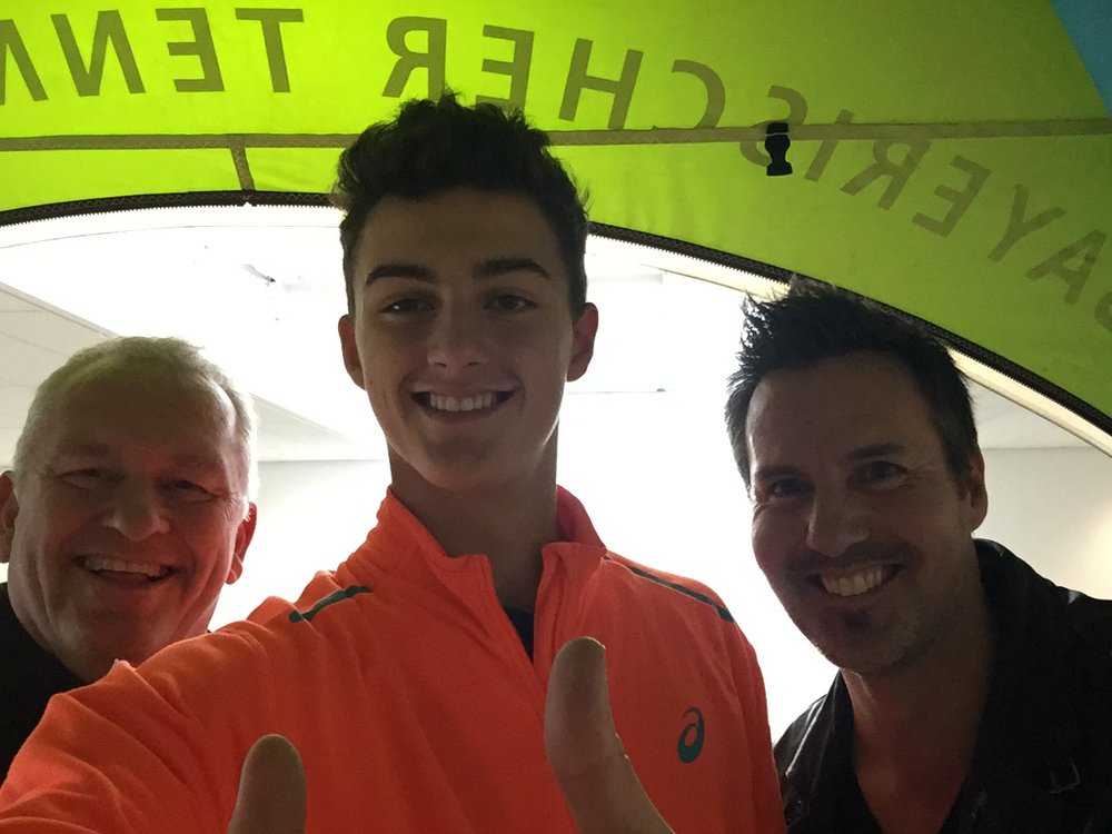 Er trug immer ein Lächeln auf den Lippen: Axel Mitterer (links) hier an jenem Tag im Oktober 2015, an dem Alexander Erler (Mitte) einst seinen ersten ATP-Einzel-Weltranglistenpunkt in Oberhaching erobert hatte. Rechts Erlers Onkel und Manager Markus Erler.